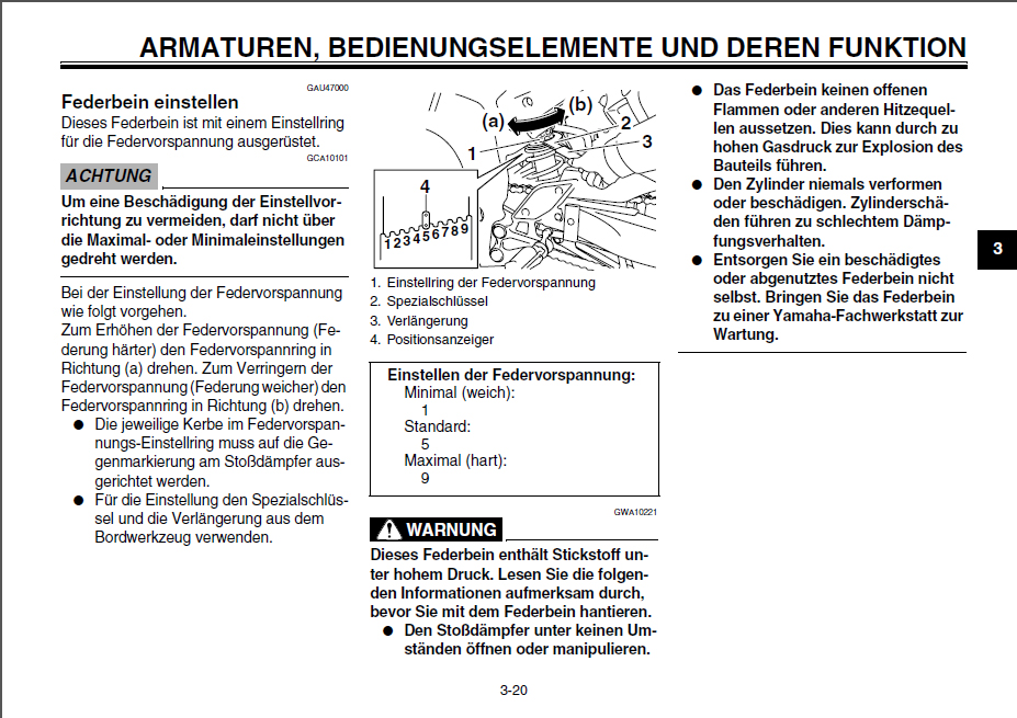 Die Drehrichtung (a) zum erhöhen der Federvorspannung ist richtig, ebenso wie die Beschreibung dazu in der linken Spalte. Die Tabelle bzgl. der "Härte" ist aber falsch: Stellung 1 wäre hart (max. Federvorspannung) und Stellung 9 weich (min. Federvorspannung).