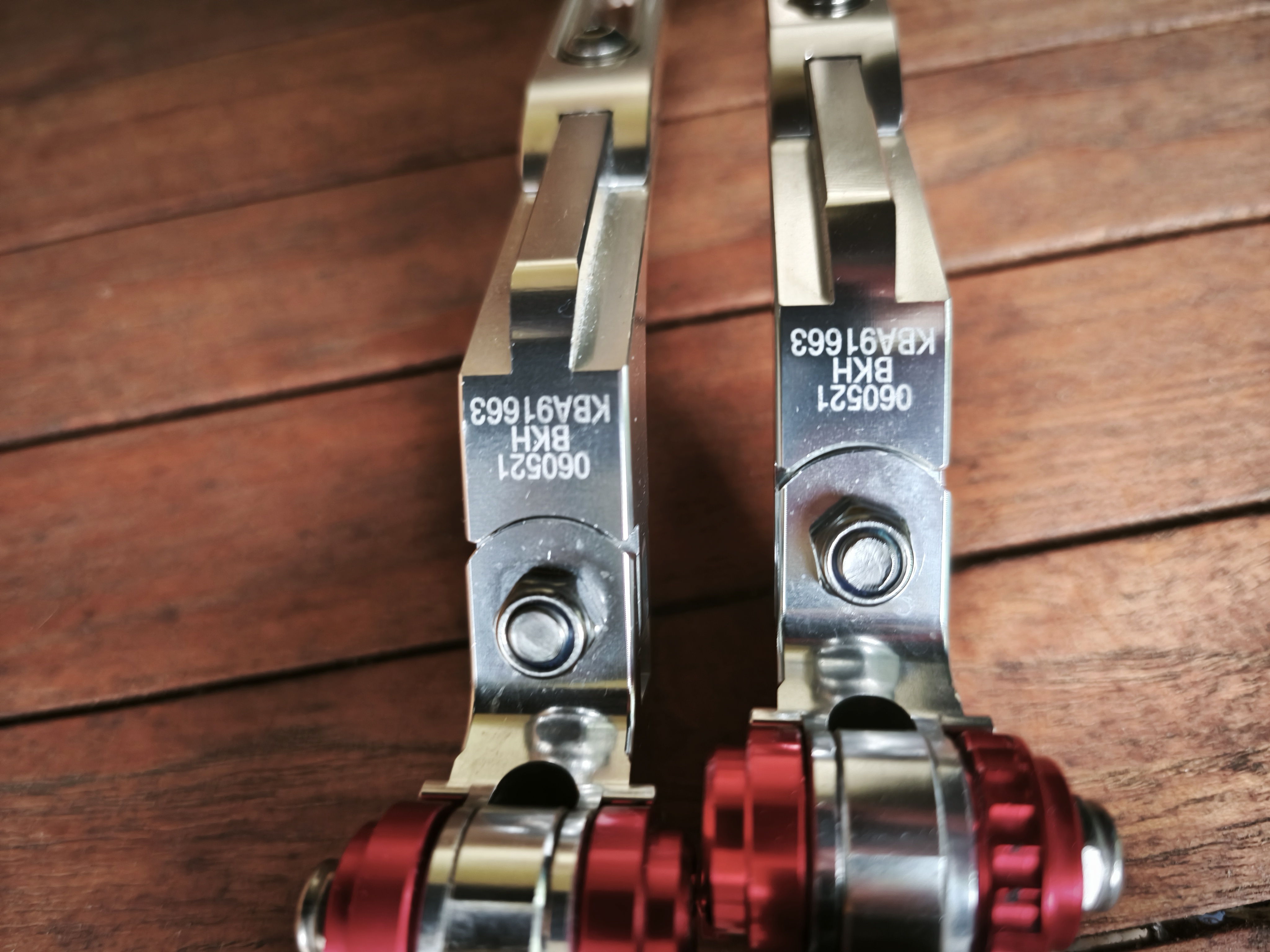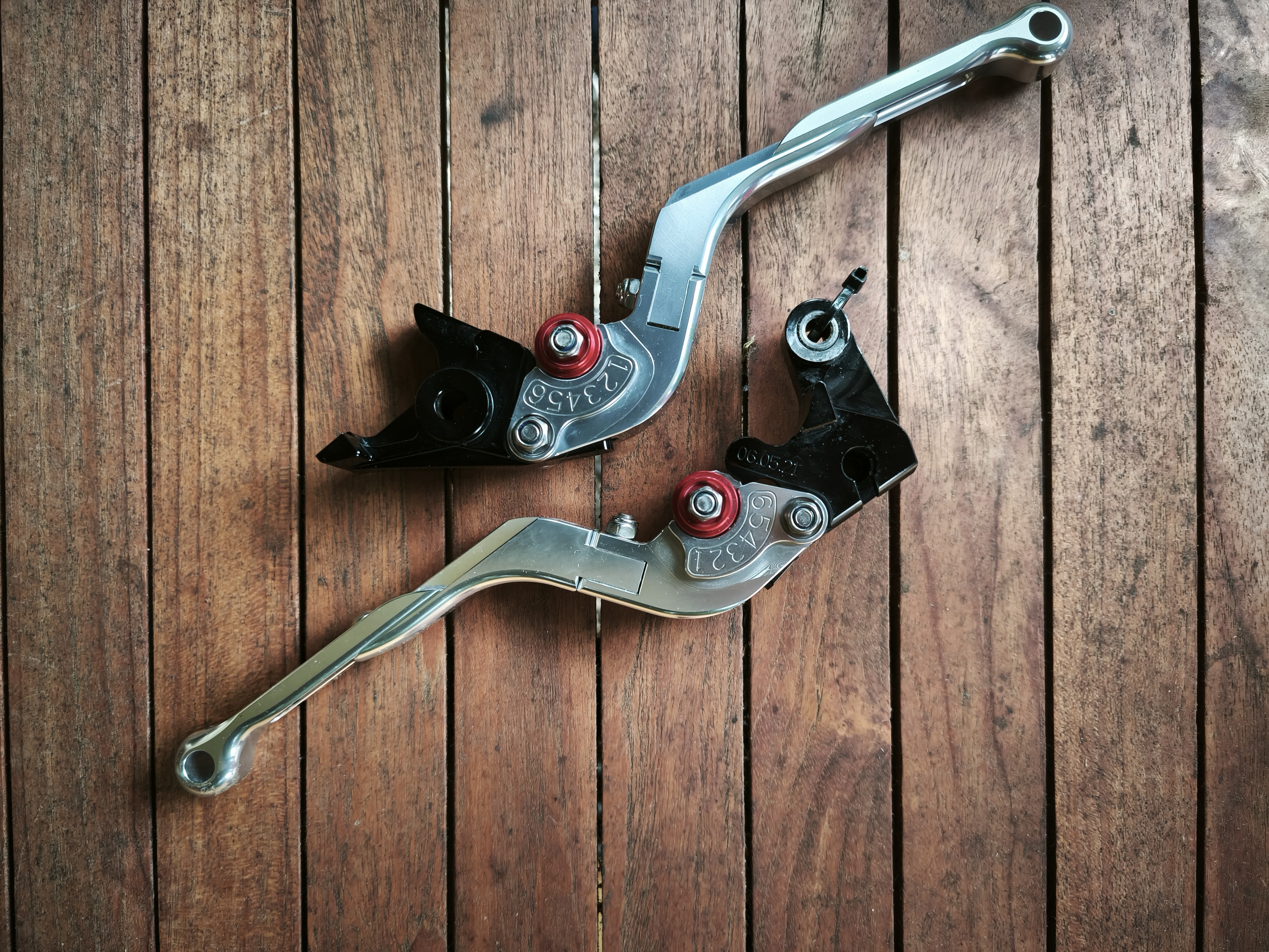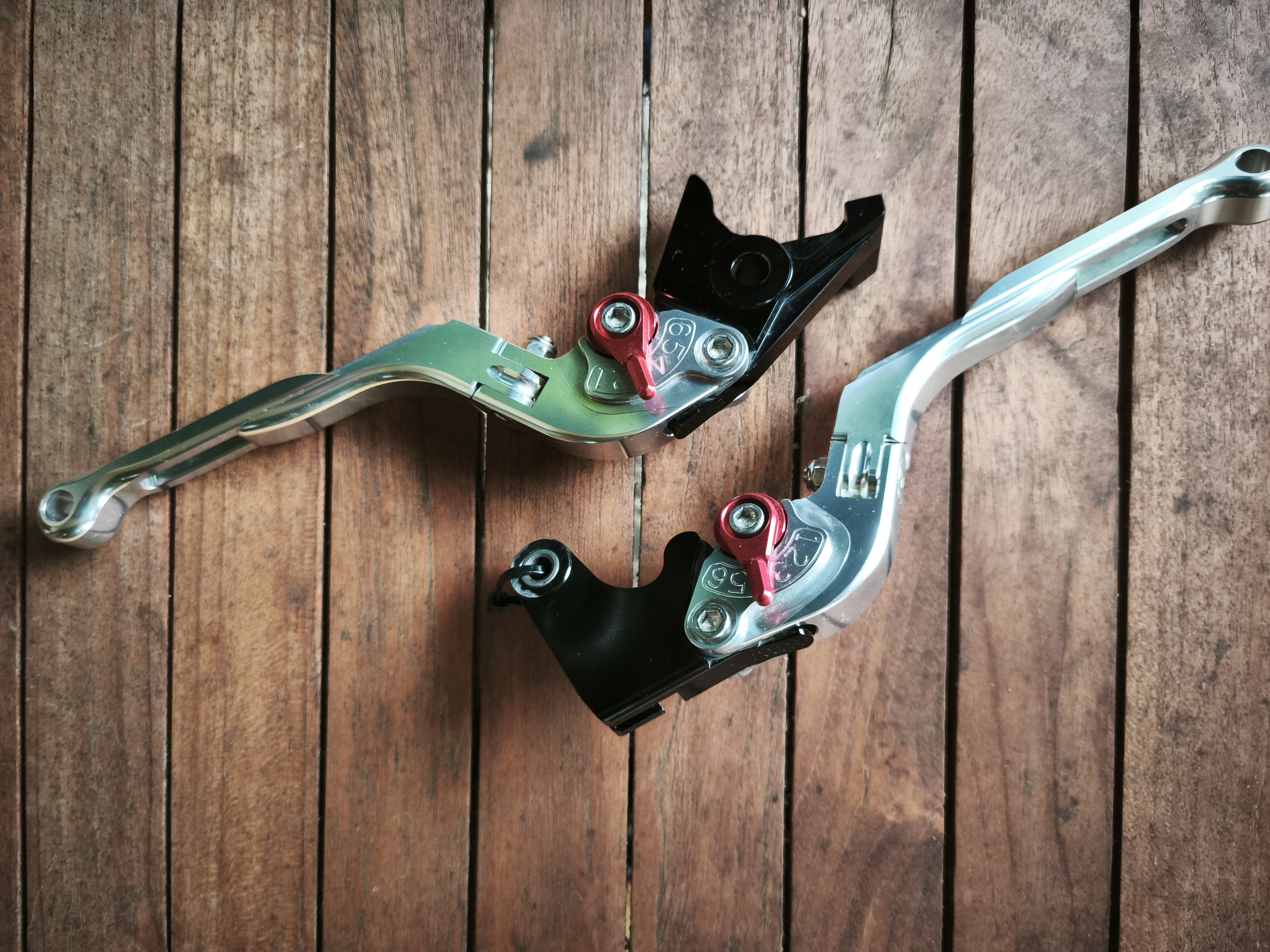 V-trec Vario, hochklappbar (Schutz vor Abbrechen bei Umfaller), verstellbare Brems- u. Kupplungshebel mit ABE (KBA-Nr. 91663). CNC gefräst aus 6061-T6 Aluminium. Hebellänge von 14 bis 17.5cm stufenlos verstellbar, Weite 6fach verstellbar